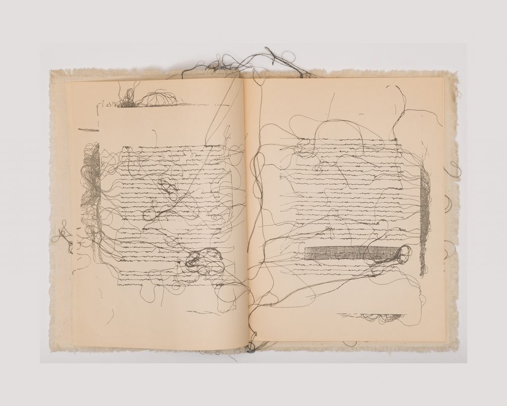 parole quasi nascoste da fili scuri, gambi e altri elementi vegetali, oppure ben ordinate e affascinanti grafie di una lingua misteriosa, su una pagina le cui righe sono fatte da fili tesi. Sempre si tratta di opere realizzate con un perfezionismo estremo. A volte,