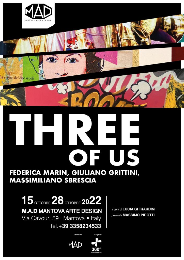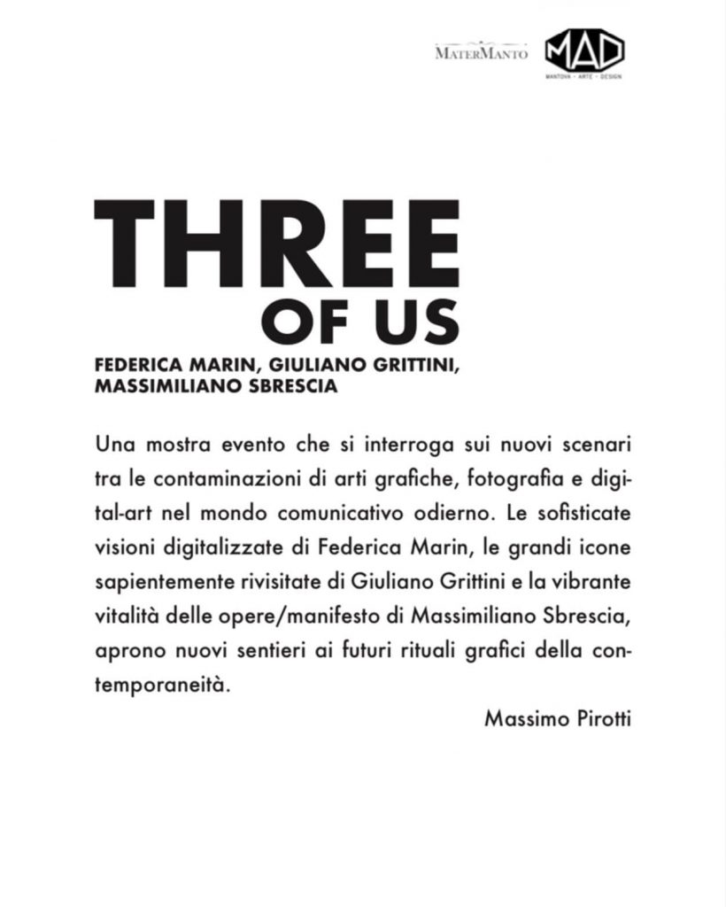 Una mostra evento che si interroga sui nuovi scenari tra le contaminazioni di arti grafiche, fotografia e digital-art nel mondo comunicativo odierno. Le sofisticate visioni digitalizzate di Federica Marin, le grandi icone sapientemente rivisitate di Giuliano Grittini e la vibrante vitalità delle opere/manifesto di Massimiliano Sbrescia, aprono nuovi sentieri ai futuri rituali grafici della contemporaneità. ?Massimo Pirotti