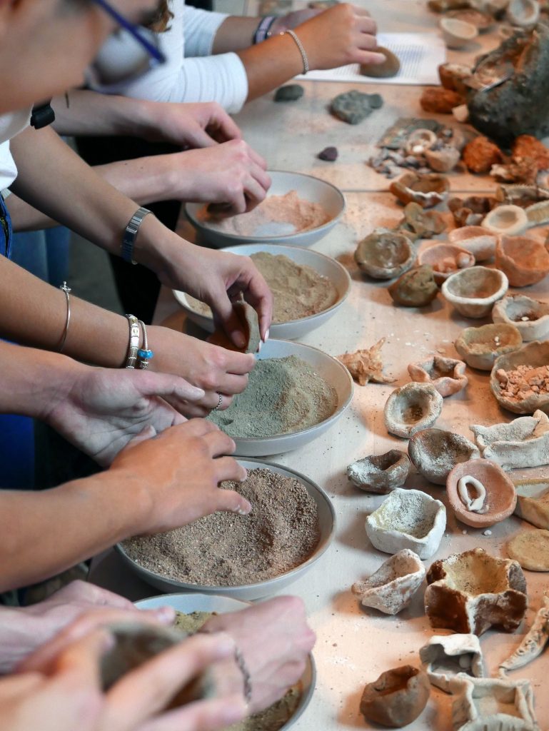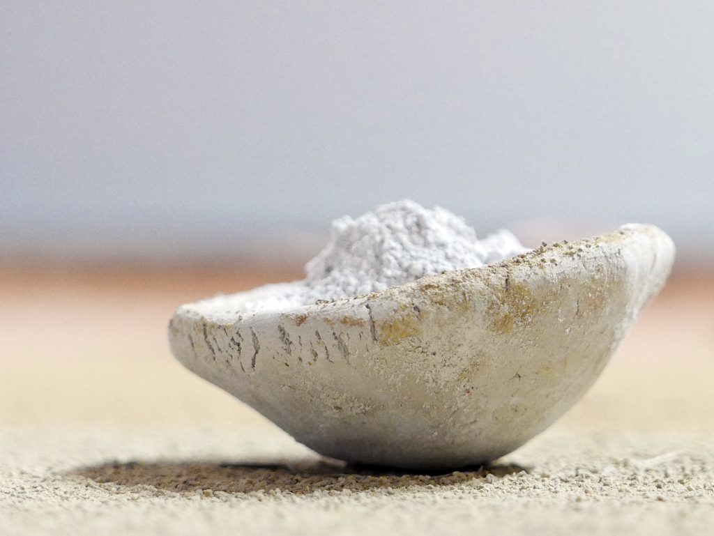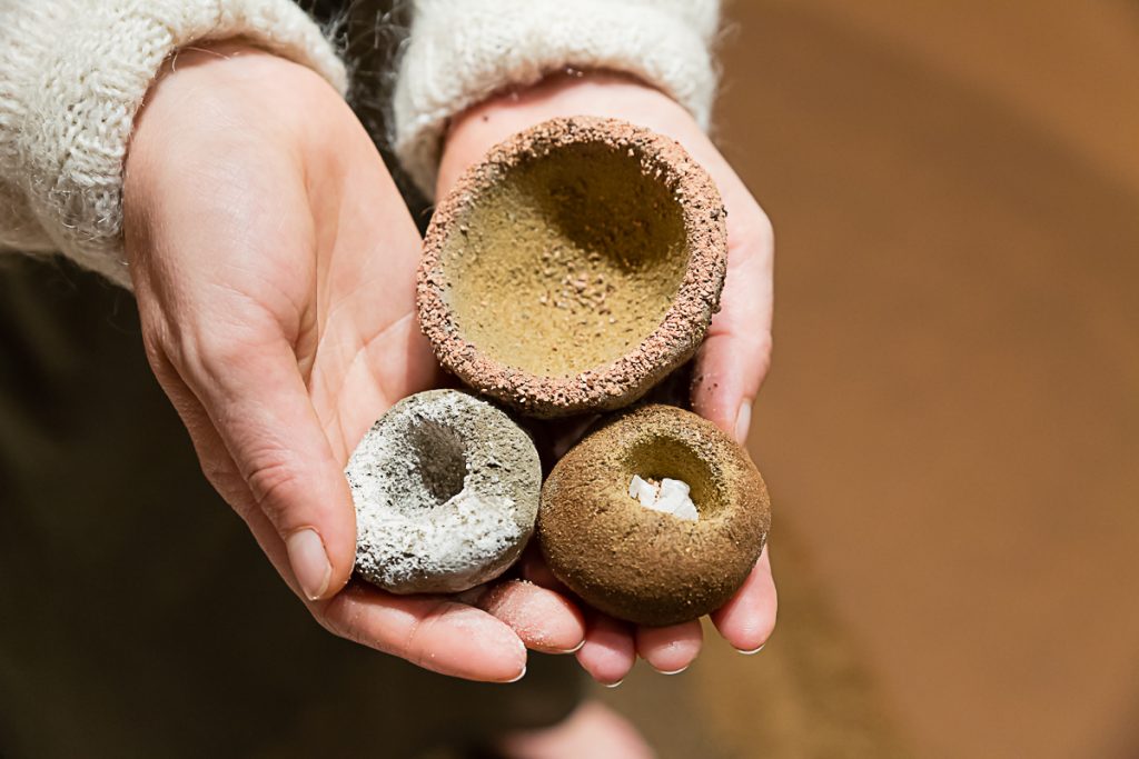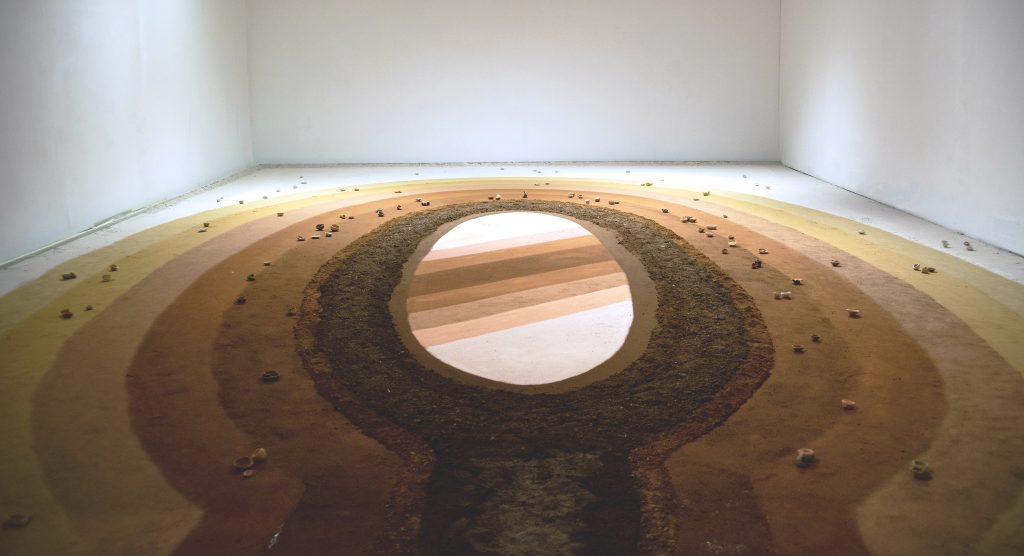 Mentre veniva disegnata da Doblanovic e Barnes, la grande composizione si è espansa in modo regolare e sistematico a partire da un’unica striscia del colore della terra, fino a includere più strisce colorate all’interno di un centro bianco di forma ellittica. Gli ovali concentrici nelle varie sfumature di marrone della terra hanno fatto sì che il centro catalizzasse gli sguardi, raggiungendo un risultato straordinario. A cominciare dalla polvere di marmo rosa, per poi passare all’ocra gialla e all’argilla rossa e arrivare al suolo di superficie nel marrone più profondo, la presenza di infinite ere pedologiche è stata trasmessa dal colore, dalle consistenze e dal ritmo, sospeso tra la materialità del tangibile e l’astratto del vuoto. I tanti recipienti lavorati con delicatezza punteggiavano l’installazione come stelle e pianeti sparsi in un universo infinito, rafforzando la sensazione di trovarsi in un altro mondo. Tuttavia, la semplicità materiale di Tocca la terra si è rivelata più vicina alla nostra vita reale, quotidiana, in un’analisi simultanea della dimensione cosmica e umana, e di come quest’ultima si rapporta alla prima.