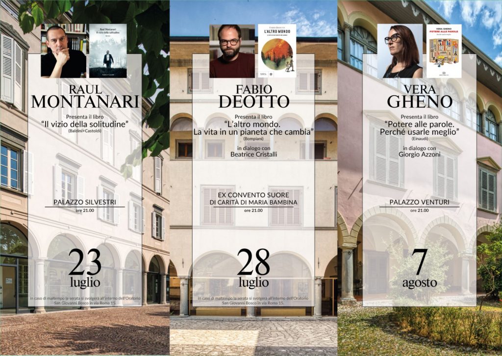 Sono tre gli incontri che avranno come protagonisti la letteratura, l’ambiente, le parole e la comunicazione. Apre la rassegna venerdì 23 luglio alle ore 21.00 presso Palazzo Silvestri, residenza in stile neoclassico che offre uno straordinario ciclo di affreschi, lo scrittore Raul Montanari che presenterà il suo ultimo libro Il vizio della solitudine (Baldini + Castoldi).