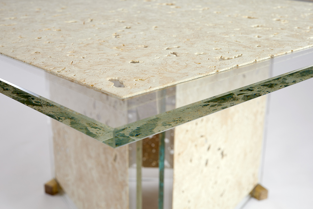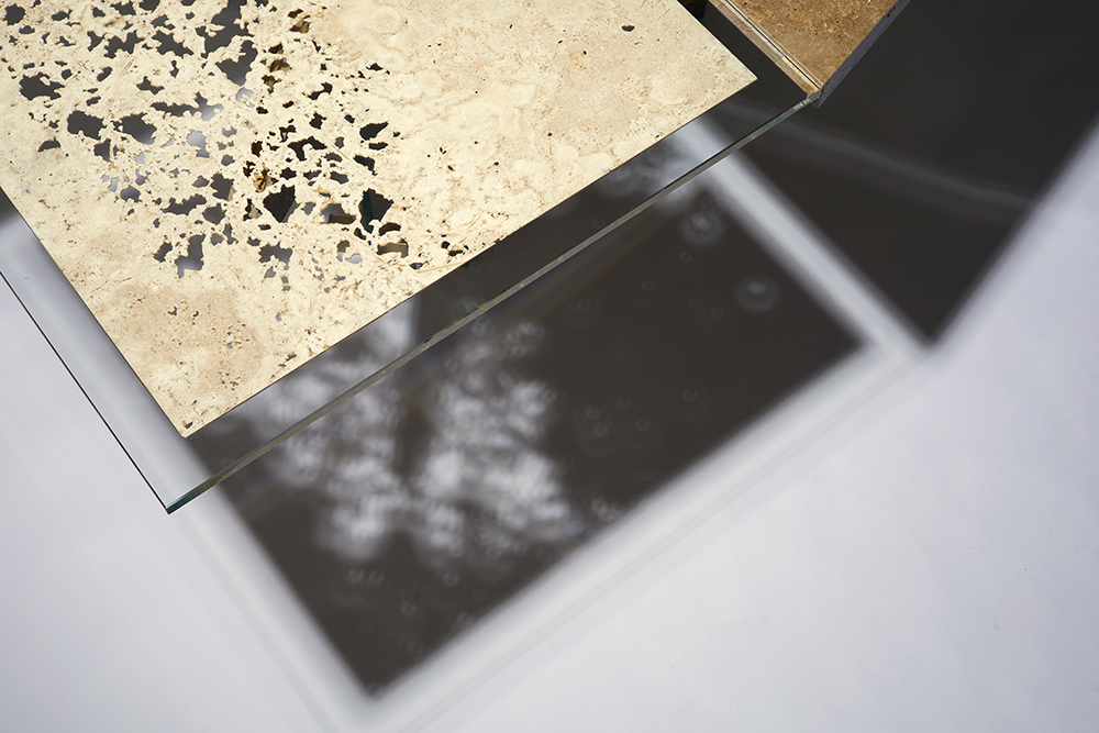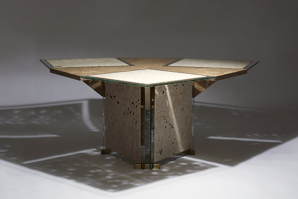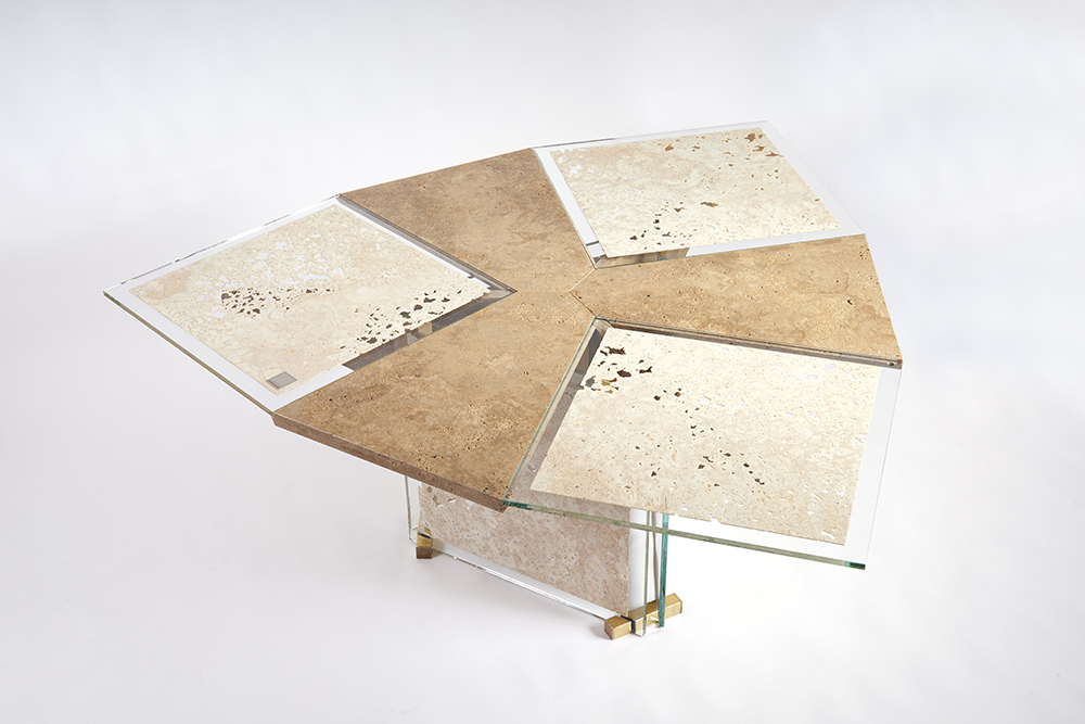 Ispirato al tema del tempo, ELICA è il risultato di un perfetto dialogo tra l'artigiano e il progettista. Metafora del moto perpetuo, la sua composizione è scandita dal numero 3, numero perfetto. Il piano è definito da un’elica a 3 pale, realizzata in marmo Travertino noce, su cui poggiano 3 lastre quadrate di vetro temperato sulle quali sono state incollate lamine di Travertino classico dello spessore di 2 mm. Altre 3 lastre quadrate posizionate a prisma, sostengono il piano del tavolo. I fori naturali del Travertino creano dei giochi di luce e ombra che donano leggerezza all’intera struttura, creando effetti inaspettati se illuminati da luce diretta o in controluce. Con ELICA l’azienda ha presentato, per la prima volta al pubblico, la lamina in Travertino in grande formato. Un tavolo che, da elemento d’arredo, diviene così scultura nello spazio, elemento scenografico che muta nel tempo e produce meraviglia in chi la guarda.