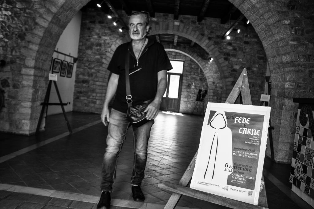 I Fujenti della Madonna dell’Arco, seguiti da Calafiore in un percorso che documenta la devozione di migliaia di fedeli in pellegrinaggio. Le immagini esposte non si limitano alla cronaca dell’evento, ma esplorano il rapporto tra corpo e fede, tra identità collettiva e dimensione spirituale, tra il gesto rituale e il paesaggio umano in cui si compie. Il progetto nasce dall’esigenza di restituire dignità e profondità a pratiche spesso viste con distanza o folklorizzate, mettendo in luce la complessità emotiva, sociale e culturale di queste manifestazioni. “Tra Fede e Carne” è un invito a riflettere sul senso del sacro nella contemporaneità, sulla persistenza delle tradizioni e sulla forza con cui certe comunità continuano a vivere e reinventare i propri riti.