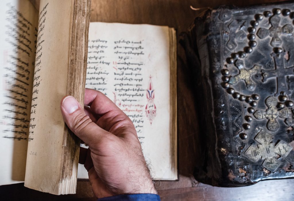 Le prime foto scattate in Italia mostrano volti dai fieri tratti armeni come quello di Rupen, uomo dallo sguardo intenso quanto la sua storia, ritratto a Bari tra i tappeti di cui il suo paese di origine è grande produttore. Non solo volti, ma anche oggetti e simboli possono raccontare storie; allo stesso modo l’alfabeto armeno dischiude un mondo, come traspare dal particolare di uno degli antichi manoscritti armeni custoditi nella biblioteca del Pontificio Collegio Armeno a Roma.