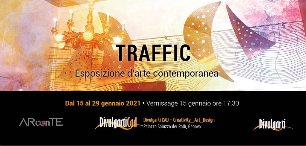 Si inaugura a Genova, venerdì 15 gennaio 2021, presso CAD Creativity Art Design, Palazzo Saluzzo dei Rolli, via Chiabrera 7/2, la mostra d'arte “Traffic”. La mostra, curata da Loredana Trestin con la collaborazione di Maria Cristina Bianchi, l'ideazione dell'Associazione ARconTE e l'organizzazione di Divulgarti, si tiene dal 15 al 29 gennaio 2021, con opere di artisti provenienti da diverse parti del mondo.