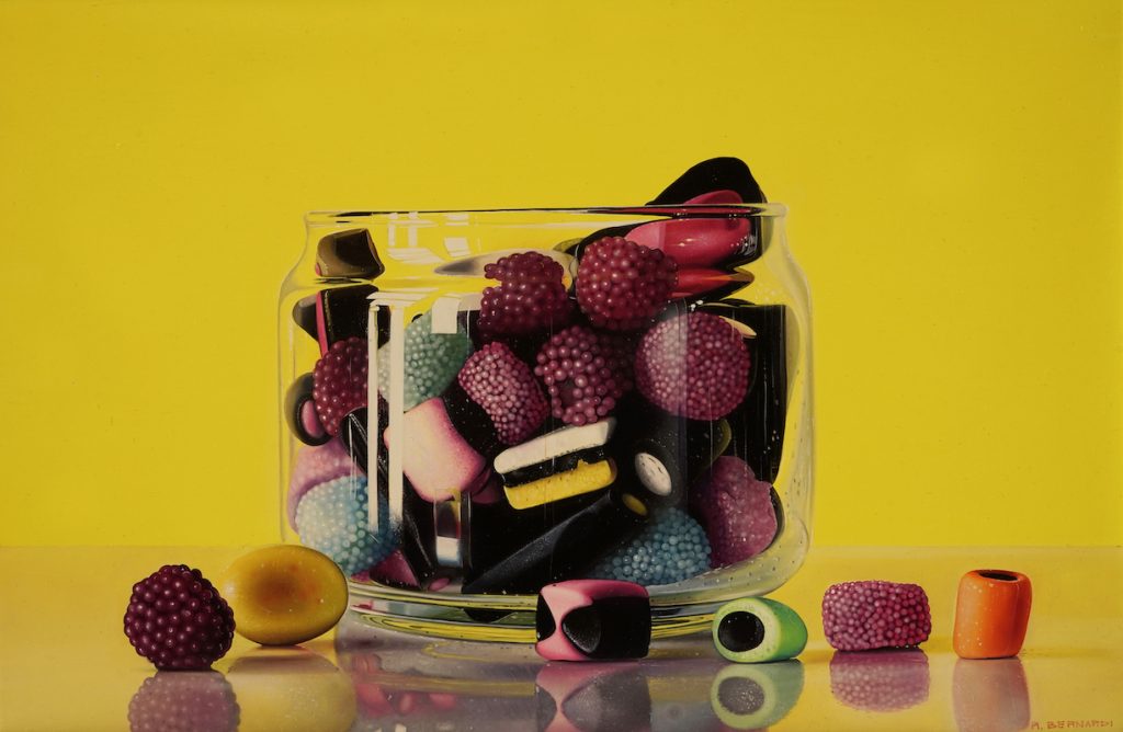 Ce lo dimostrano le caramelle e i dolci di ROBERTO BERNARDI, virati in una palette di colori accesi e accattivanti, avvolti in strati di cellophane dai bagliori accecanti, che ci attraggono come calamite per precipitarci in un mondo impossibile, un paese dei balocchi terribilmente seduttivo che nella sua splendente frivolezza mette a nudo la superficialità dell’oggi. Ce lo spiegano i frutti di OTTORINO DE LUCCHI, colti con la precisione di una tecnica intrigante – quella dell’acquerello a secco – che ne rende vellutate le superfici, verissimi fino al piccolo solco lasciato da un insetto sulla buccia della mela, eppure impossibili così persi in quegli sfondi senza limiti, librati in un universo metafisico che rende credibile anche che una ciotola possa stare in bilico su quello che sembra l’orizzonte del mondo. E poi ce lo dice VALENTINA CECI con la sua mappatura compulsiva di raffinerie e stabilimenti industriali, resi in punta di penna a sfera tubo dopo tubo, serbatoio dopo serbatoio, e poi, però, lanciati in un cielo tiepolesco, soffice, che sembra poterli ingoiare, annullando e negando tutto l’ingegno dell’uomo. E anche CASAGRANDE & RECALCATI con i loro fiori sensuali, spalancati, splendenti, di cui pare di potere cogliere il profumo, fiori che poi, però, a un secondo sguardo rivelano petali accartocciati, al limite dell’appassimento; e poi con i prati disseminati di oggetti estranei, animali infidi e presenze inquietanti che ribaltano la nostra lettura del reale. E infine ce lo suggerisce NICOLA NANNINI, che per una volta spalanca le porte delle case con cui ci ha incantato e ce ne svela le stanze più segrete. Le sue camere con i letti disfatti – squisiti giochi di panneggi sulle lenzuola candide – raccontano in silenzio amori e addii, abitudini e sicurezze, noia e passione, in punta di pennello, verissimi, qui e ora, eppure intrisi di memorie e nostalgia.