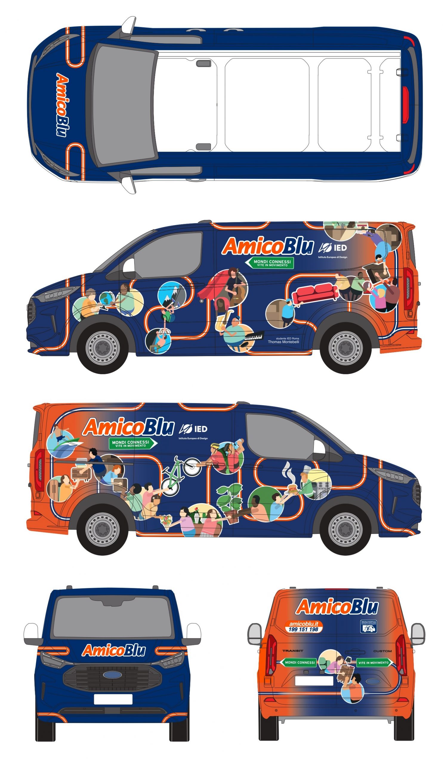 L’elaborato grafico di Thomas Montebelli, studente del primo anno del corso di Illustrazione e Animazione, è stato selezionato nell’ambito del progetto speciale lanciato da AmicoBlu in collaborazione con l’Istituto Europeo di Design di Roma. La livrea dal design unico, ispirata al concept del Fuorisalone 2025 “Mondi Connessi, Vite in Movimento”, prenderà vita durante la Design Week, rivestendo uno dei furgoni AmicoBlu.