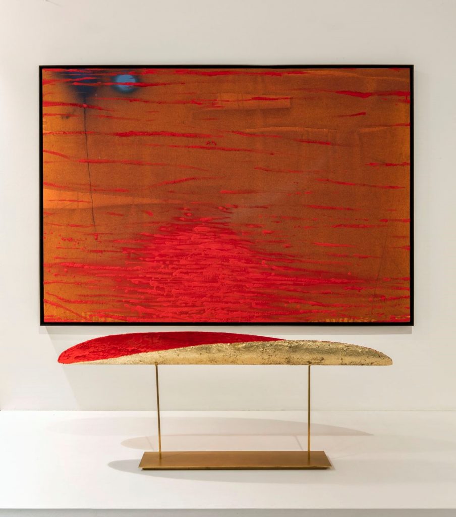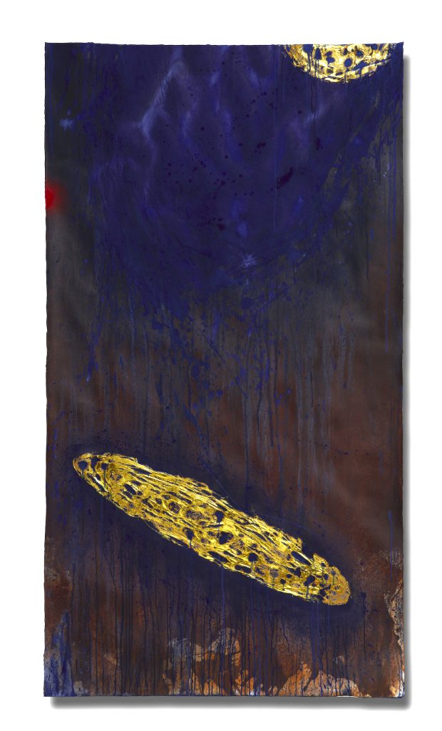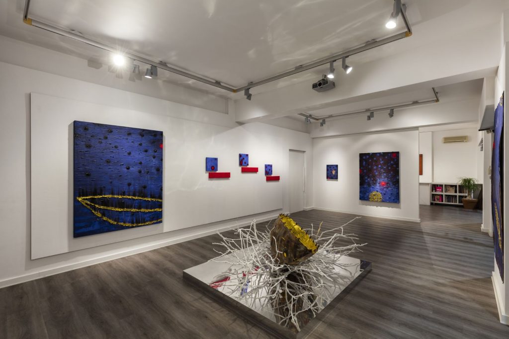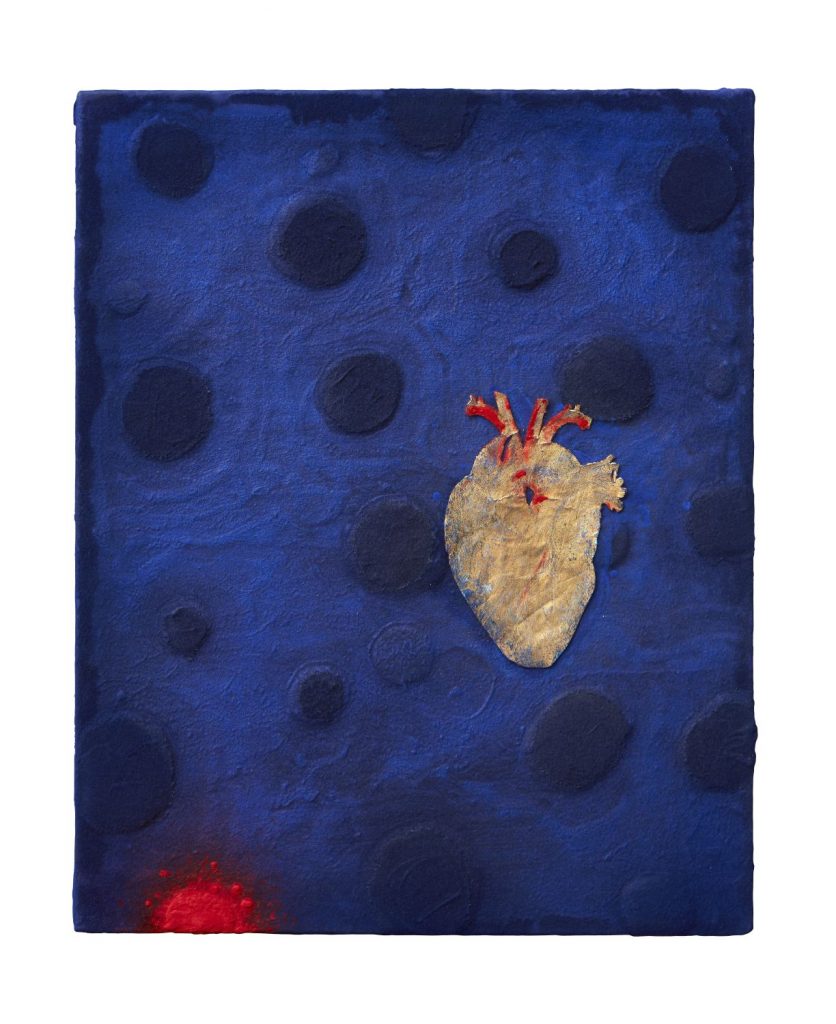 Come non riconoscere, nei segni che attraversano quel blu, il movimento delle onde, delle correnti? Nelle sue macchie di rosso, la traccia di una ferita che ogni giorno si rinnova, ma anche la metafora di una speranza che non cessa di essere coltivata? Nei suoi ori, la metafora ulteriore di un altrove da immaginare, e da inventare? Nei suoi cuori sospesi la rappresentazione del viaggio e dell’esilio – intesi come vite in bilico, provvisorie, precarie, prive di terra sotto i piedi”.