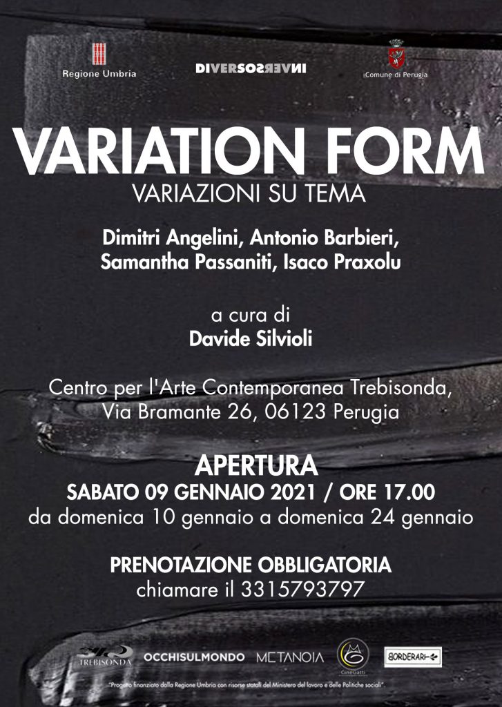 La terza proposta, dopo lo stop imposto, vede la presenza di Dimitri Angelini, Antonio Barbieri, Samantha Passaniti e Isaco Praxolu, quattro artisti di diversa formazione e linguaggio, in mostra nel progetto VARIATION FORM – Variazioni su tema, a cura di Davide Silvioli.