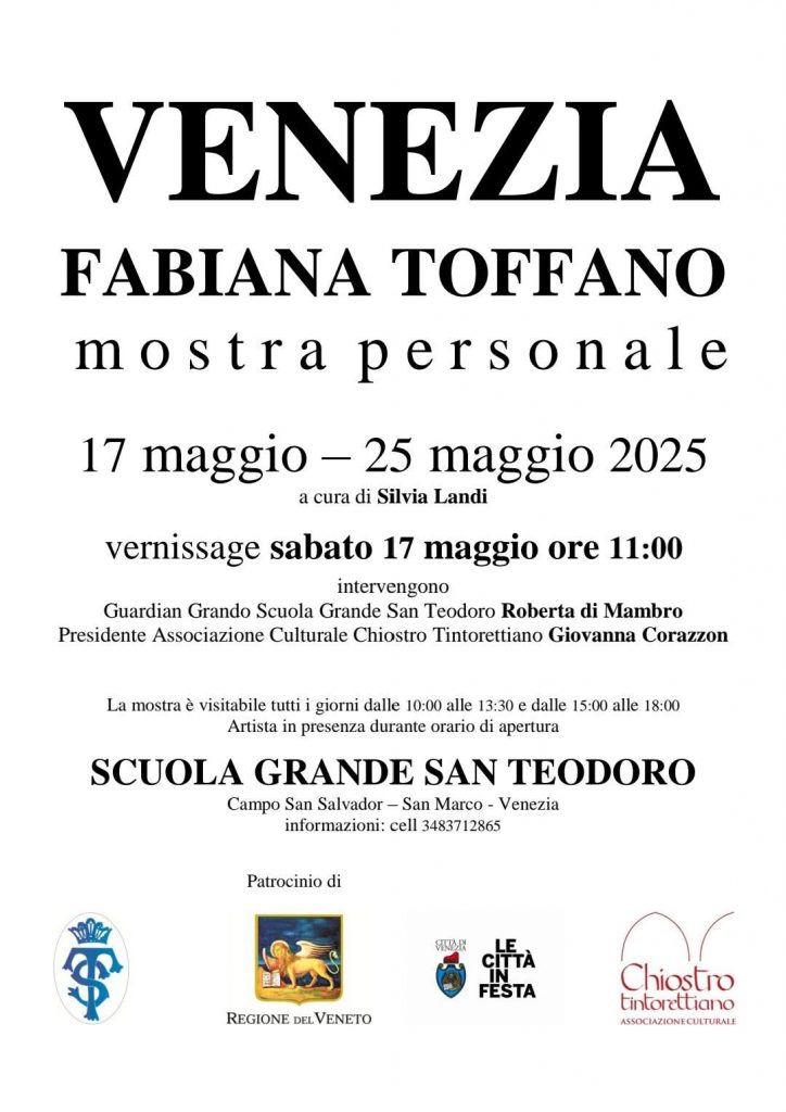 Sabato 17 maggio 2025 alle ore 11:00 sarà inaugurata la mostra personale “Venezia” dell’artista veneziana Fabiana Toffano e contestualmente presentato il libro “Venezia – Fabiana Toffano” a cura di Silvia Landi, con interventi di Roberta Di Mambro e Giovanna Corazzon rispettivamente Guardian Grando della Scuola Grande San Teodoro e Presidente dell’Associazione Culturale Chiostro Tintorettiano. La mostra rimarrà visitabile fino al 25 maggio 2025 .