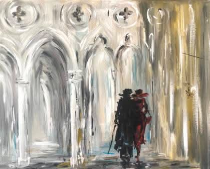 La mostra è ricca di svariate opere d’arte che rappresentano spazi e ambientazioni veneziane. Archi e arcate tipiche di Venezia spesso si trovano nei dipinti dell’artista come alcune figure in abiti d’epoca caratteristici del suo stile pittorico e angoli meno noti al turismo li rende vivi e magici.