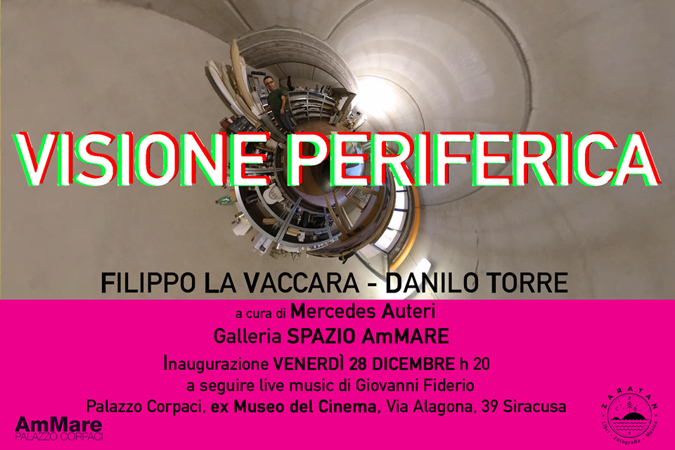 La Galleria SPAZIO AmMARE è lieta di presentare Visione Periferica il nuovo progetto espositivo con opere di Filippo La Vaccara e Danilo Torre, curato da Mercedes Auteri. Verrà proiettato in anteprima l'ultimo video del filmmaker Danilo Torre (Catania, 1976), sull'artista Filippo La Vaccara (Catania, 1972) che, per l'occasione, presenta alcune opere inedite concepite negli ultimi mesi, proprio durante le riprese del film.