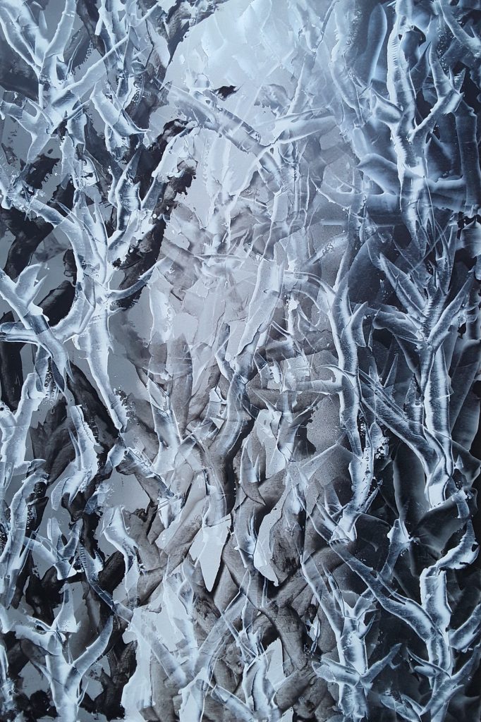 Nei lavori dell’artista Scoppa si notano riferimenti allo spirituale di Kandinskij, alla problematica sociale del femminicidio (gli intrecci come metafora delle relazioni). Chiaro è anche il riferimento, attraverso l’utilizzo del grigio, al grande maestro del contemporaneo Gerhard Richter.