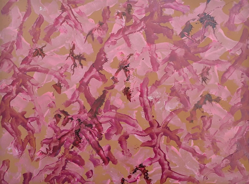 Nei lavori dell’artista Scoppa si notano riferimenti allo spirituale di Kandinskij, alla problematica sociale del femminicidio (gli intrecci come metafora delle relazioni). Chiaro è anche il riferimento, attraverso l’utilizzo del grigio, al grande maestro del contemporaneo Gerhard Richter.