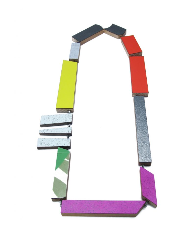 Nei gioielli modulari della belga Karen Vanmol, le forme architettoniche si trovano plasmate in orecchini, collane e bracciali costruiti secondo sequenze cromatiche che giocano con i movimenti del corpo.