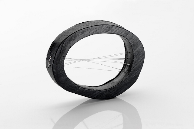 Carbonizzando il legno da lei raccolto, l’artista unisce oro e argento per dar vita ad un ideale di gioiello incentrato sulla relazione tra luce e ombra, in un continuo richiamo alla natura e alla geometria pura.