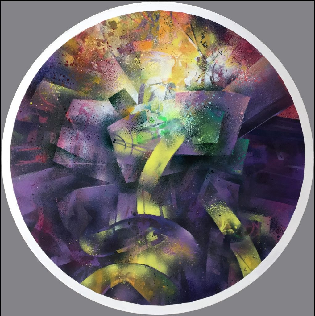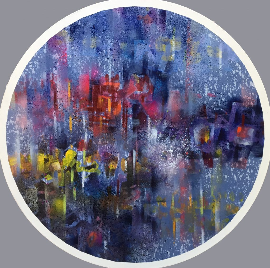 E’ ovvio che questa altro non è che una via di fuga, ma da qualche parte bisognerà pur rifugiarsi. Ebbene, dopo aver aperto questo rotondo pertugio e gettato lo sguardo come un sasso nello stagno, osservo e provo a riportare gli esiti di questa intrusione. Come da una quinta di teatro, con tutta la loro energia e le loro potenzialità, i colori scendono in campo. Le evoluzioni cominciano e i protagonisti prendono vita in rappresentazioni e sembianze allusive, in duelli e danze, nel gioco e nel teatro (spesso sbeffeggiando le umane debolezze), in forme geometriche o informali, potenti o pulviscolari, stridenti o armoniose, luminose o crepuscolari. Nell’atmosfera pregna di vitalità si dipana il racconto e pare di sentire un sottofondo di coro arcano, talvolta anche di Rock duro o atmosfere Ambient.