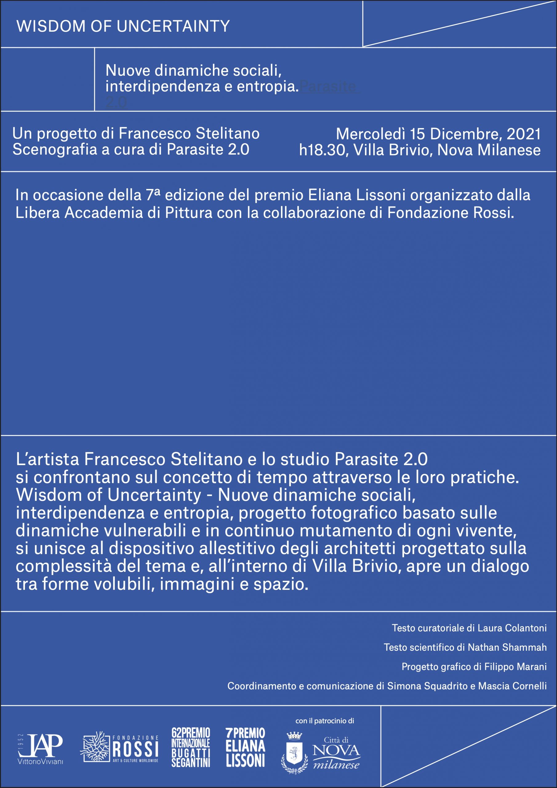 In attesa della settima edizione del Premio di fotografia Eliana Lissoni, siamo lieti di annunciare Wisdom of Uncertainty, un progetto realizzato insieme all’artista Francesco Stelitano e al collettivo Parasite 2.0.  Wisdom of Uncertainty prosegue il discorso avviato con la mostra ADESSO!, realizzata lo scorso ottobre dalla Fondazione Rossi per la sezione speciale e internazionale del 62° Premio Bugatti Segantini.