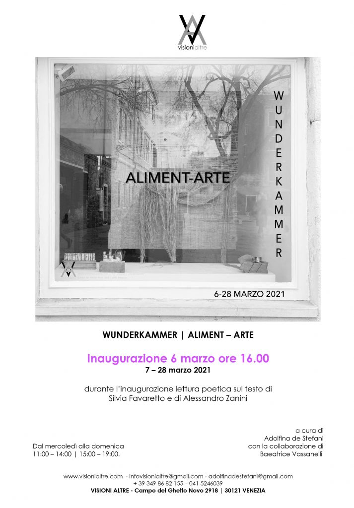 L’evento espositivo ALIMENT - ARTE che dal 6 al 28 marzo 2021, vuole rappresentare e divenire il luogo-contenitore nel quale raccogliere e mostrare al pubblico le produzioni artistiche più recenti di gruppi eterogenei di artisti, ciascuno presente in mostra con pochi e selezionati lavori e posto in dialogo diretto con i linguaggi degli altri artisti.