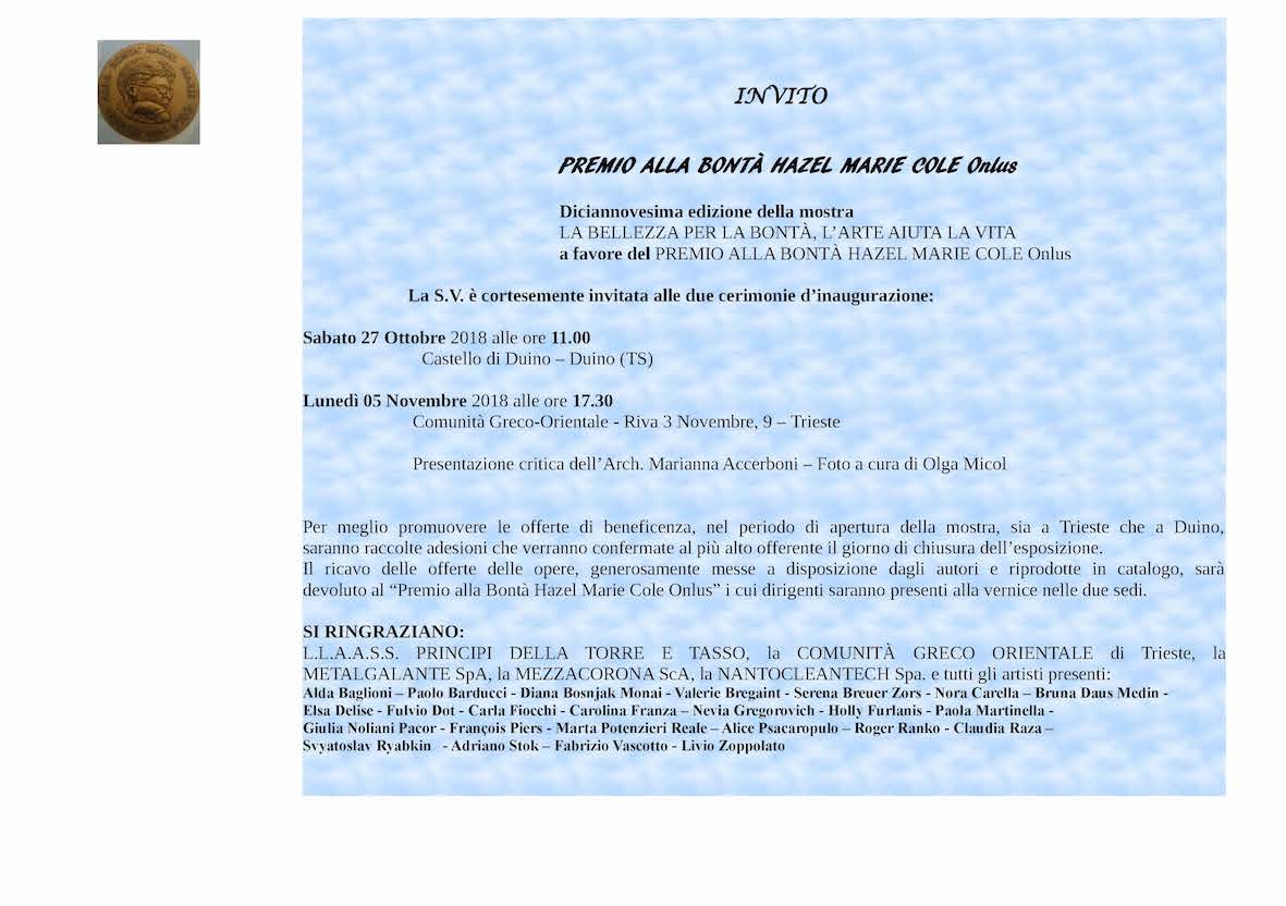 Apre sabato 27 ottobre alle ore 11 al Castello di Duino la XIX edizione della mostra d'arte intitolata La bellezza per la bontà, l’arte aiuta la vita, organizzata a favore del Premio alla Bontà Hazel Marie Cole Onlus