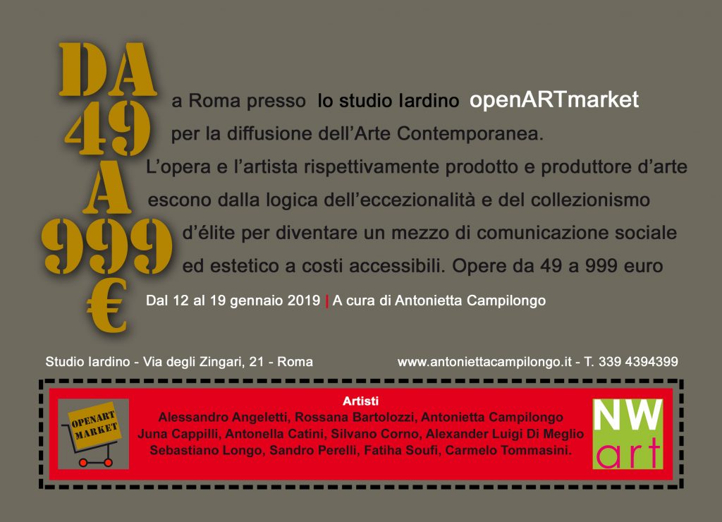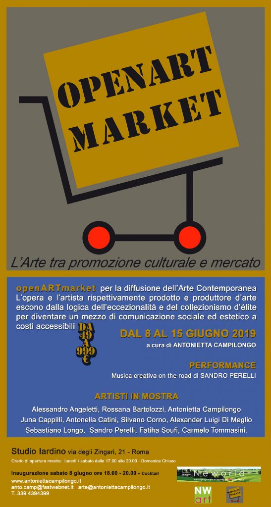 Openartmarket. Un’esposizione-mercato in cui l’opera e l’artista, rispettivamente prodotto e produttore d’arte, escono dalla logica dell’eccezionalità e del collezionismo d’élite, per diventare un mezzo di comunicazione sociale ed estetico a costi accessibile a tutti.