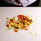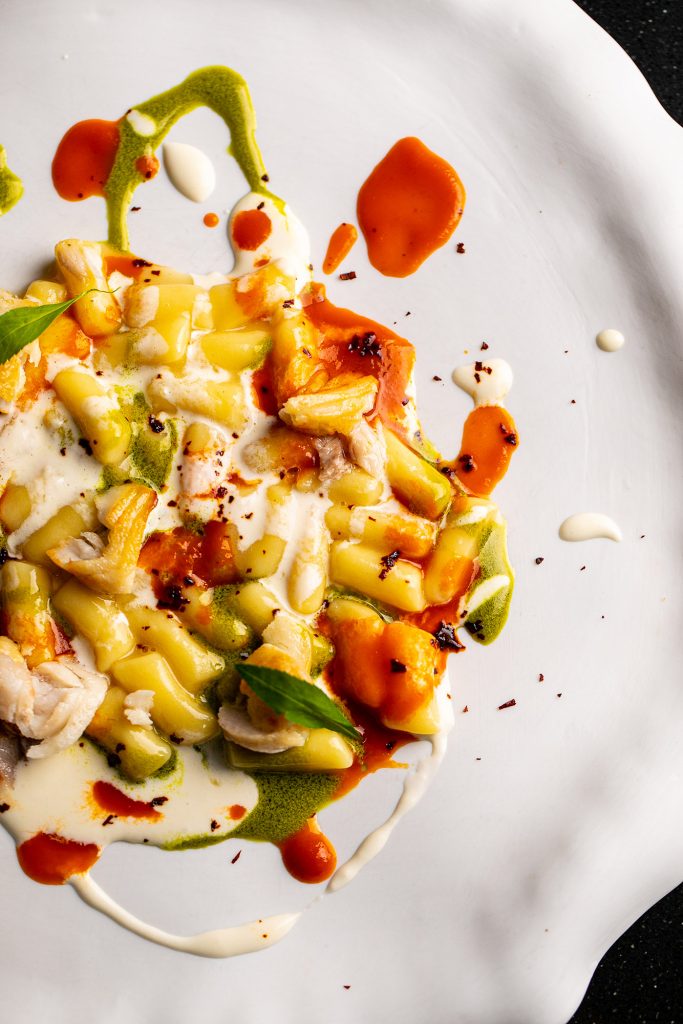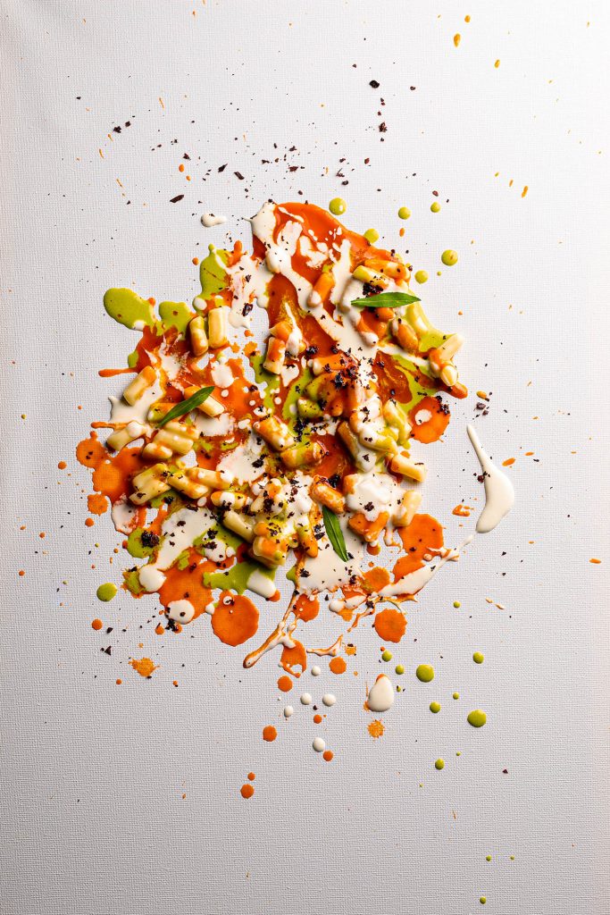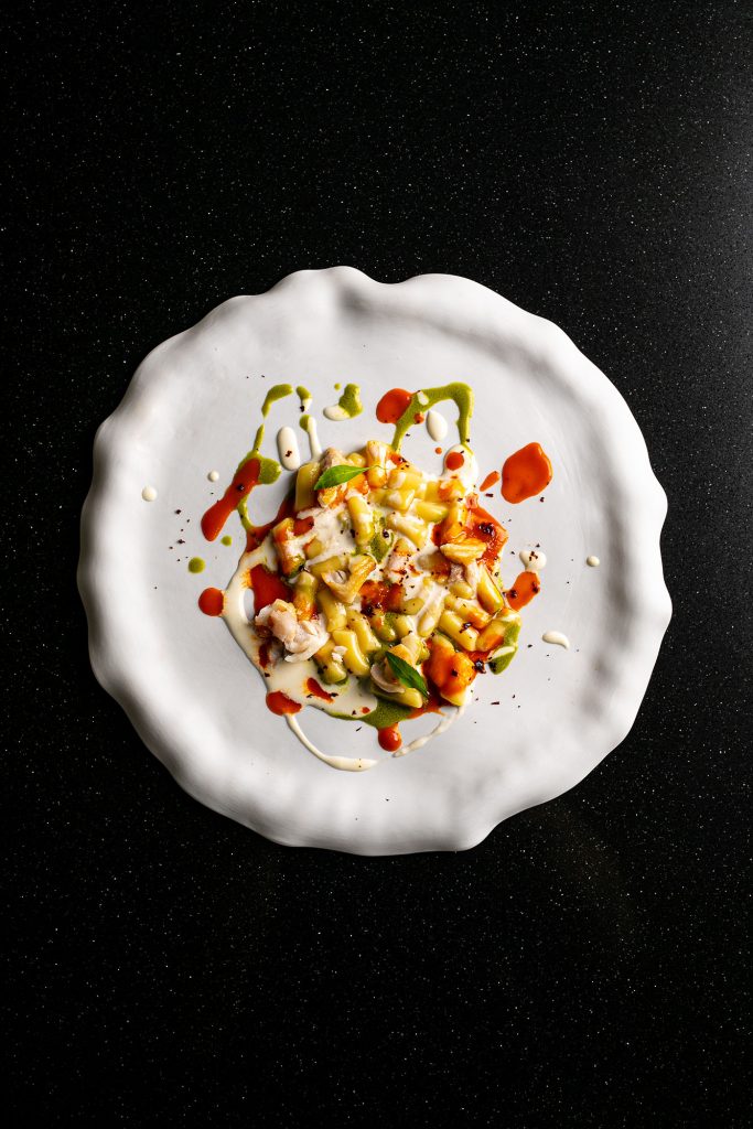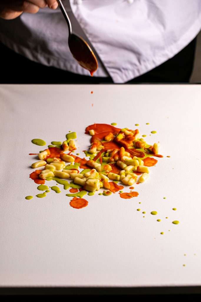 Il piatto è un primo di mare, composto da gnocco, black cod, peperone crusco, dragoncello, stracciatella e limone, ed è fortemente ispirato alle opere della corrente dell’espressionismo astratto e dell’action painting.